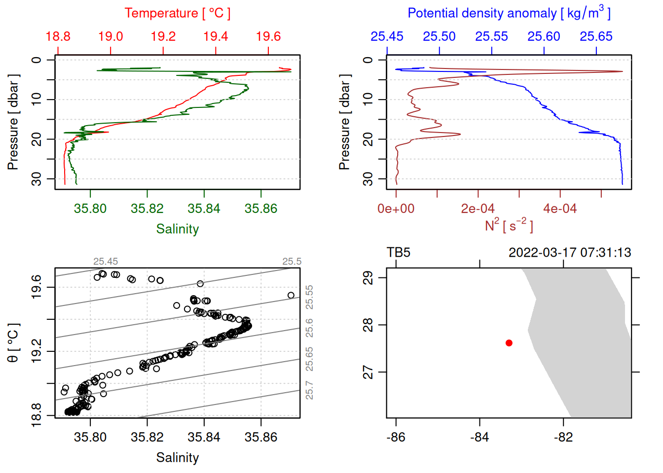 # TODO: Include param here that specifies to handle QC flags. This should be done before converting to a OCE object. QC flag columns are listed in [this spreadsheet](https://docs.google.com/spreadsheets/d/1uCxEmJRqErU-HCQiRQ1FpyiIqtNaGgMSBI0WvrtwBRU/edit?gid=137286311#gid=137286311) and are not supposed to be included in the oce object. QC param values are : # 1 good# 2 +/- 3*std_dev# 4 +/- 5*std_dev# 9 missing# Data column should be set to NA if corresponding QC column has value greater than threshold (recommended threshold is 5*std_dev).# Will need to loop through *_qc columns.# TODO: drop spikes (how? low-pass?).# TODO: combine replicate sensors (eg temp1 temp2).