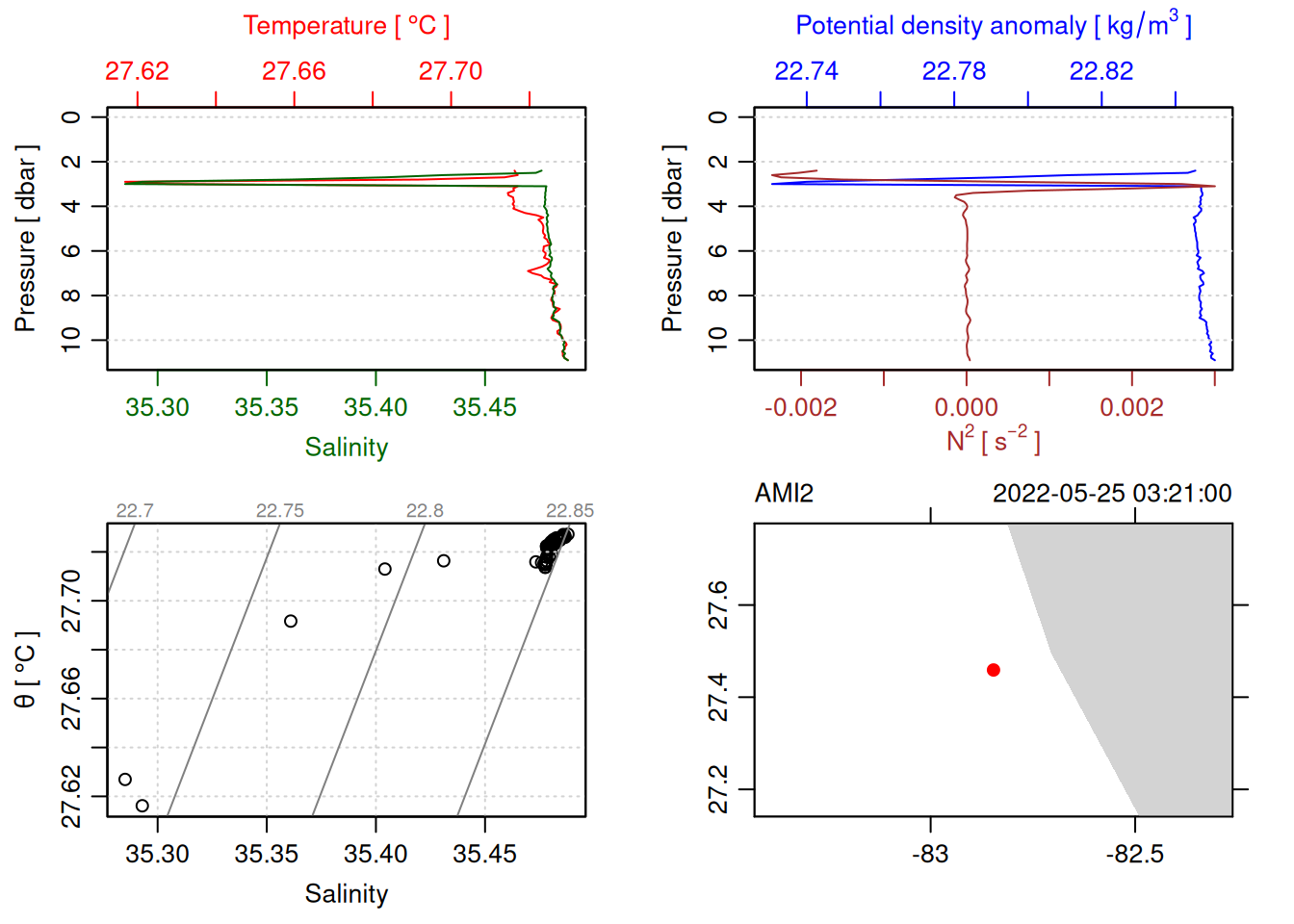 tryCatch({ trimmed_cast <-ctdTrim(cast) decimated_cast <-ctdDecimate(trimmed_cast, p =0.1)# plotting can cause the xlim failureplot(decimated_cast)# === export ===# Get the scan numbers that remain after cleaning cleaned_scans <- decimated_cast@data$scan# Load original raw data to keep all columns ctd_raw <- readr::read_csv(dataFile, show_col_types =FALSE)# Filter raw data to only include the cleaned scans cast_df <- ctd_raw %>%filter(!is.na(sea_water_pressure)) %>%# Remove rows without pressure datamutate(row_num =row_number()) %>%filter(row_num %in% cleaned_scans) %>%select(-row_num)# Add metadata cast_df <-mutate( cast_df,station = station_id,cruise_id = cruise_id )# Check if there are any rows in the cleaned dataif (nrow(cast_df) ==0) {cat("\n=== WARNING: NO DATA AFTER CLEANING ===\n")cat("Cast ID:", params$cast_id, "\n")cat("Station:", station_id, "\n")cat("Cruise:", cruise_id, "\n\n")cat("Raw data rows (with pressure):", sum(!is.na(ctd_raw$sea_water_pressure)), "\n")cat("Cleaned scans to keep:", length(cleaned_scans), "\n")cat("Resulting rows:", nrow(cast_df), "\n\n")cat("Raw data summary:\n")print(summary(ctd_raw[c("sea_water_pressure", "sea_water_temperature", "sea_water_salinity")]))cat("\nCleaned scans (first 20):\n")print(head(cleaned_scans, 20))cat("\n=== CSV FILE NOT CREATED (no data) ===\n\n") } else {# create folder if doesn't exist clean_data_loc <- here::here("data/02_clean")try(fs::dir_create(clean_data_loc))# save ctd to .csv (without row names/indices)write.csv(cast_df, glue("{clean_data_loc}/{params$cast_id}.csv"), row.names =FALSE)cat("Successfully saved", nrow(cast_df), "rows to", glue("{params$cast_id}.csv"), "\n") }}, error =function(e) {cat("\n=== CTD PROCESSING ERROR ===\n")cat("Cast ID:", params$cast_id, "\n")cat("Error message:\n", conditionMessage(e), "\n\n")# Safely inspect objects that might or might not exist when the error happenedif (exists("decimated_cast")) { df <-try(as.data.frame(decimated_cast@data), silent =TRUE)if (!inherits(df, "try-error")) {cat("Dataframe columns:\n")print(names(df))cat("\nSummary of key columns (scan, pressure, temperature, salinity if present):\n") known_cols <-intersect(c("scan", "pressure", "temp", "temperature", "salinity", "conductivity"), names(df))print(summary(df[known_cols], digits =3))cat("\nHead of dataframe:\n")print(head(df)) } else {cat("Could not extract dataframe from decimated_cast.\n") } } else {cat("decimated_cast was never created before the error.\n") }cat("\n=== END ERROR DEBUG INFO ===\n\n")})
