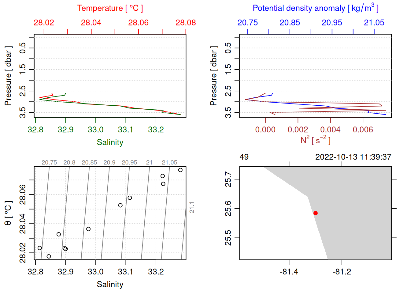 tryCatch({ trimmed_cast <-ctdTrim(cast) decimated_cast <-ctdDecimate(trimmed_cast, p =0.1)# plotting can cause the xlim failureplot(decimated_cast)# === export ===# Get the scan numbers that remain after cleaning cleaned_scans <- decimated_cast@data$scan# Load original raw data to keep all columns ctd_raw <- readr::read_csv(dataFile, show_col_types =FALSE)# Filter raw data to only include the cleaned scans cast_df <- ctd_raw %>%filter(!is.na(sea_water_pressure)) %>%# Remove rows without pressure datamutate(row_num =row_number()) %>%filter(row_num %in% cleaned_scans) %>%select(-row_num)# Add metadata cast_df <-mutate( cast_df,station = station_id,cruise_id = cruise_id )# Check if there are any rows in the cleaned dataif (nrow(cast_df) ==0) {cat("\n=== WARNING: NO DATA AFTER CLEANING ===\n")cat("Cast ID:", params$cast_id, "\n")cat("Station:", station_id, "\n")cat("Cruise:", cruise_id, "\n\n")cat("Raw data rows (with pressure):", sum(!is.na(ctd_raw$sea_water_pressure)), "\n")cat("Cleaned scans to keep:", length(cleaned_scans), "\n")cat("Resulting rows:", nrow(cast_df), "\n\n")cat("Raw data summary:\n")print(summary(ctd_raw[c("sea_water_pressure", "sea_water_temperature", "sea_water_salinity")]))cat("\nCleaned scans (first 20):\n")print(head(cleaned_scans, 20))cat("\n=== CSV FILE NOT CREATED (no data) ===\n\n") } else {# create folder if doesn't exist clean_data_loc <- here::here("data/02_clean")try(fs::dir_create(clean_data_loc))# save ctd to .csv (without row names/indices)write.csv(cast_df, glue("{clean_data_loc}/{params$cast_id}.csv"), row.names =FALSE)cat("Successfully saved", nrow(cast_df), "rows to", glue("{params$cast_id}.csv"), "\n") }}, error =function(e) {cat("\n=== CTD PROCESSING ERROR ===\n")cat("Cast ID:", params$cast_id, "\n")cat("Error message:\n", conditionMessage(e), "\n\n")# Safely inspect objects that might or might not exist when the error happenedif (exists("decimated_cast")) { df <-try(as.data.frame(decimated_cast@data), silent =TRUE)if (!inherits(df, "try-error")) {cat("Dataframe columns:\n")print(names(df))cat("\nSummary of key columns (scan, pressure, temperature, salinity if present):\n") known_cols <-intersect(c("scan", "pressure", "temp", "temperature", "salinity", "conductivity"), names(df))print(summary(df[known_cols], digits =3))cat("\nHead of dataframe:\n")print(head(df)) } else {cat("Could not extract dataframe from decimated_cast.\n") } } else {cat("decimated_cast was never created before the error.\n") }cat("\n=== END ERROR DEBUG INFO ===\n\n")})