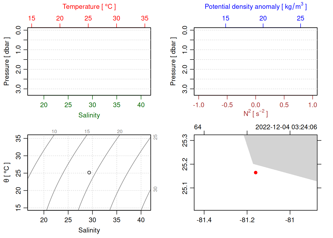 tryCatch({ trimmed_cast <-ctdTrim(cast) decimated_cast <-ctdDecimate(trimmed_cast, p =0.1)# plotting can cause the xlim failureplot(decimated_cast)# === export ===# Get the scan numbers that remain after cleaning cleaned_scans <- decimated_cast@data$scan# Load original raw data to keep all columns ctd_raw <- readr::read_csv(dataFile, show_col_types =FALSE)# Filter raw data to only include the cleaned scans cast_df <- ctd_raw %>%filter(!is.na(sea_water_pressure)) %>%# Remove rows without pressure datamutate(row_num =row_number()) %>%filter(row_num %in% cleaned_scans) %>%select(-row_num)# Add metadata cast_df <-mutate( cast_df,station = station_id,cruise_id = cruise_id )# Check if there are any rows in the cleaned dataif (nrow(cast_df) ==0) {cat("\n=== WARNING: NO DATA AFTER CLEANING ===\n")cat("Cast ID:", params$cast_id, "\n")cat("Station:", station_id, "\n")cat("Cruise:", cruise_id, "\n\n")cat("Raw data rows (with pressure):", sum(!is.na(ctd_raw$sea_water_pressure)), "\n")cat("Cleaned scans to keep:", length(cleaned_scans), "\n")cat("Resulting rows:", nrow(cast_df), "\n\n")cat("Raw data summary:\n")print(summary(ctd_raw[c("sea_water_pressure", "sea_water_temperature", "sea_water_salinity")]))cat("\nCleaned scans (first 20):\n")print(head(cleaned_scans, 20))cat("\n=== CSV FILE NOT CREATED (no data) ===\n\n") } else {# create folder if doesn't exist clean_data_loc <- here::here("data/02_clean")try(fs::dir_create(clean_data_loc))# save ctd to .csv (without row names/indices)write.csv(cast_df, glue("{clean_data_loc}/{params$cast_id}.csv"), row.names =FALSE)cat("Successfully saved", nrow(cast_df), "rows to", glue("{params$cast_id}.csv"), "\n") }}, error =function(e) {cat("\n=== CTD PROCESSING ERROR ===\n")cat("Cast ID:", params$cast_id, "\n")cat("Error message:\n", conditionMessage(e), "\n\n")# Safely inspect objects that might or might not exist when the error happenedif (exists("decimated_cast")) { df <-try(as.data.frame(decimated_cast@data), silent =TRUE)if (!inherits(df, "try-error")) {cat("Dataframe columns:\n")print(names(df))cat("\nSummary of key columns (scan, pressure, temperature, salinity if present):\n") known_cols <-intersect(c("scan", "pressure", "temp", "temperature", "salinity", "conductivity"), names(df))print(summary(df[known_cols], digits =3))cat("\nHead of dataframe:\n")print(head(df)) } else {cat("Could not extract dataframe from decimated_cast.\n") } } else {cat("decimated_cast was never created before the error.\n") }cat("\n=== END ERROR DEBUG INFO ===\n\n")})