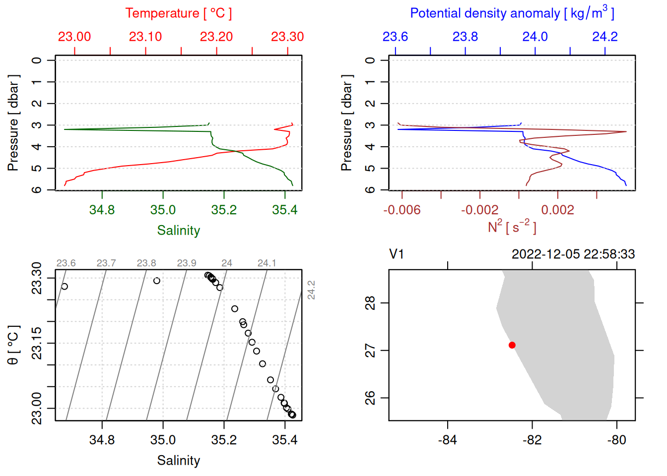 tryCatch({ trimmed_cast <-ctdTrim(cast) decimated_cast <-ctdDecimate(trimmed_cast, p =0.1)# plotting can cause the xlim failureplot(decimated_cast)# === export ===# Get the scan numbers that remain after cleaning cleaned_scans <- decimated_cast@data$scan# Load original raw data to keep all columns ctd_raw <- readr::read_csv(dataFile, show_col_types =FALSE)# Filter raw data to only include the cleaned scans cast_df <- ctd_raw %>%filter(!is.na(sea_water_pressure)) %>%# Remove rows without pressure datamutate(row_num =row_number()) %>%filter(row_num %in% cleaned_scans) %>%select(-row_num)# Add metadata cast_df <-mutate( cast_df,station = station_id,cruise_id = cruise_id )# Check if there are any rows in the cleaned dataif (nrow(cast_df) ==0) {cat("\n=== WARNING: NO DATA AFTER CLEANING ===\n")cat("Cast ID:", params$cast_id, "\n")cat("Station:", station_id, "\n")cat("Cruise:", cruise_id, "\n\n")cat("Raw data rows (with pressure):", sum(!is.na(ctd_raw$sea_water_pressure)), "\n")cat("Cleaned scans to keep:", length(cleaned_scans), "\n")cat("Resulting rows:", nrow(cast_df), "\n\n")cat("Raw data summary:\n")print(summary(ctd_raw[c("sea_water_pressure", "sea_water_temperature", "sea_water_salinity")]))cat("\nCleaned scans (first 20):\n")print(head(cleaned_scans, 20))cat("\n=== CSV FILE NOT CREATED (no data) ===\n\n") } else {# create folder if doesn't exist clean_data_loc <- here::here("data/02_clean")try(fs::dir_create(clean_data_loc))# save ctd to .csv (without row names/indices)write.csv(cast_df, glue("{clean_data_loc}/{params$cast_id}.csv"), row.names =FALSE)cat("Successfully saved", nrow(cast_df), "rows to", glue("{params$cast_id}.csv"), "\n") }}, error =function(e) {cat("\n=== CTD PROCESSING ERROR ===\n")cat("Cast ID:", params$cast_id, "\n")cat("Error message:\n", conditionMessage(e), "\n\n")# Safely inspect objects that might or might not exist when the error happenedif (exists("decimated_cast")) { df <-try(as.data.frame(decimated_cast@data), silent =TRUE)if (!inherits(df, "try-error")) {cat("Dataframe columns:\n")print(names(df))cat("\nSummary of key columns (scan, pressure, temperature, salinity if present):\n") known_cols <-intersect(c("scan", "pressure", "temp", "temperature", "salinity", "conductivity"), names(df))print(summary(df[known_cols], digits =3))cat("\nHead of dataframe:\n")print(head(df)) } else {cat("Could not extract dataframe from decimated_cast.\n") } } else {cat("decimated_cast was never created before the error.\n") }cat("\n=== END ERROR DEBUG INFO ===\n\n")})