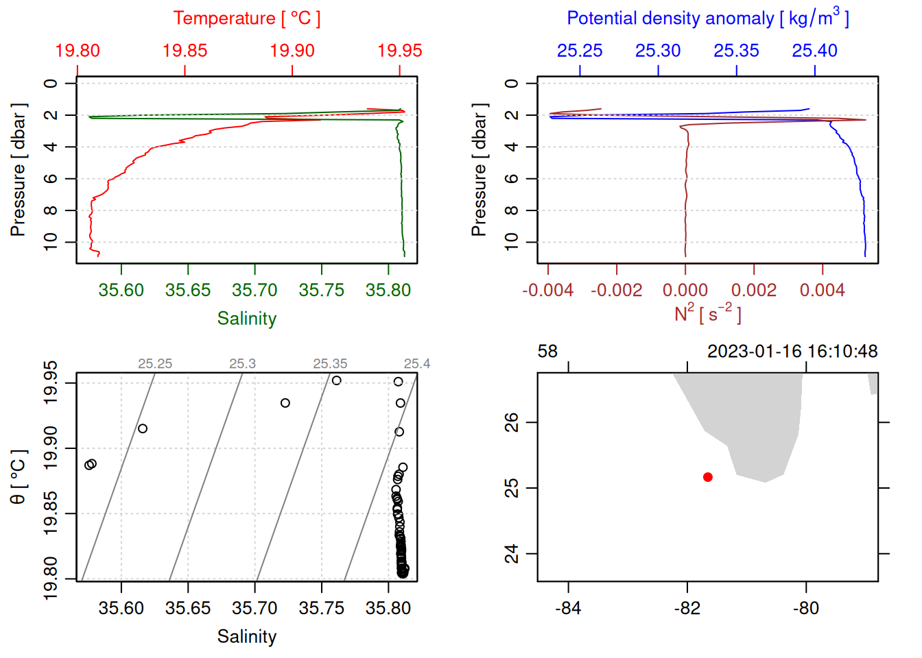 tryCatch({ trimmed_cast <-ctdTrim(cast) decimated_cast <-ctdDecimate(trimmed_cast, p =0.1)# plotting can cause the xlim failureplot(decimated_cast)# === export ===# Get the scan numbers that remain after cleaning cleaned_scans <- decimated_cast@data$scan# Load original raw data to keep all columns ctd_raw <- readr::read_csv(dataFile, show_col_types =FALSE)# Filter raw data to only include the cleaned scans cast_df <- ctd_raw %>%filter(!is.na(sea_water_pressure)) %>%# Remove rows without pressure datamutate(row_num =row_number()) %>%filter(row_num %in% cleaned_scans) %>%select(-row_num)# Add metadata cast_df <-mutate( cast_df,station = station_id,cruise_id = cruise_id )# Check if there are any rows in the cleaned dataif (nrow(cast_df) ==0) {cat("\n=== WARNING: NO DATA AFTER CLEANING ===\n")cat("Cast ID:", params$cast_id, "\n")cat("Station:", station_id, "\n")cat("Cruise:", cruise_id, "\n\n")cat("Raw data rows (with pressure):", sum(!is.na(ctd_raw$sea_water_pressure)), "\n")cat("Cleaned scans to keep:", length(cleaned_scans), "\n")cat("Resulting rows:", nrow(cast_df), "\n\n")cat("Raw data summary:\n")print(summary(ctd_raw[c("sea_water_pressure", "sea_water_temperature", "sea_water_salinity")]))cat("\nCleaned scans (first 20):\n")print(head(cleaned_scans, 20))cat("\n=== CSV FILE NOT CREATED (no data) ===\n\n") } else {# create folder if doesn't exist clean_data_loc <- here::here("data/02_clean")try(fs::dir_create(clean_data_loc))# save ctd to .csv (without row names/indices)write.csv(cast_df, glue("{clean_data_loc}/{params$cast_id}.csv"), row.names =FALSE)cat("Successfully saved", nrow(cast_df), "rows to", glue("{params$cast_id}.csv"), "\n") }}, error =function(e) {cat("\n=== CTD PROCESSING ERROR ===\n")cat("Cast ID:", params$cast_id, "\n")cat("Error message:\n", conditionMessage(e), "\n\n")# Safely inspect objects that might or might not exist when the error happenedif (exists("decimated_cast")) { df <-try(as.data.frame(decimated_cast@data), silent =TRUE)if (!inherits(df, "try-error")) {cat("Dataframe columns:\n")print(names(df))cat("\nSummary of key columns (scan, pressure, temperature, salinity if present):\n") known_cols <-intersect(c("scan", "pressure", "temp", "temperature", "salinity", "conductivity"), names(df))print(summary(df[known_cols], digits =3))cat("\nHead of dataframe:\n")print(head(df)) } else {cat("Could not extract dataframe from decimated_cast.\n") } } else {cat("decimated_cast was never created before the error.\n") }cat("\n=== END ERROR DEBUG INFO ===\n\n")})