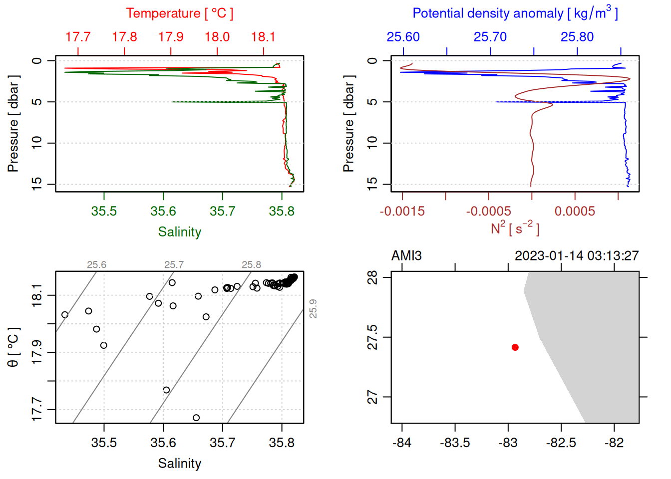 tryCatch({ trimmed_cast <-ctdTrim(cast) decimated_cast <-ctdDecimate(trimmed_cast, p =0.1)# plotting can cause the xlim failureplot(decimated_cast)# === export ===# Get the scan numbers that remain after cleaning cleaned_scans <- decimated_cast@data$scan# Load original raw data to keep all columns ctd_raw <- readr::read_csv(dataFile, show_col_types =FALSE)# Filter raw data to only include the cleaned scans cast_df <- ctd_raw %>%filter(!is.na(sea_water_pressure)) %>%# Remove rows without pressure datamutate(row_num =row_number()) %>%filter(row_num %in% cleaned_scans) %>%select(-row_num)# Add metadata cast_df <-mutate( cast_df,station = station_id,cruise_id = cruise_id )# Check if there are any rows in the cleaned dataif (nrow(cast_df) ==0) {cat("\n=== WARNING: NO DATA AFTER CLEANING ===\n")cat("Cast ID:", params$cast_id, "\n")cat("Station:", station_id, "\n")cat("Cruise:", cruise_id, "\n\n")cat("Raw data rows (with pressure):", sum(!is.na(ctd_raw$sea_water_pressure)), "\n")cat("Cleaned scans to keep:", length(cleaned_scans), "\n")cat("Resulting rows:", nrow(cast_df), "\n\n")cat("Raw data summary:\n")print(summary(ctd_raw[c("sea_water_pressure", "sea_water_temperature", "sea_water_salinity")]))cat("\nCleaned scans (first 20):\n")print(head(cleaned_scans, 20))cat("\n=== CSV FILE NOT CREATED (no data) ===\n\n") } else {# create folder if doesn't exist clean_data_loc <- here::here("data/02_clean")try(fs::dir_create(clean_data_loc))# save ctd to .csv (without row names/indices)write.csv(cast_df, glue("{clean_data_loc}/{params$cast_id}.csv"), row.names =FALSE)cat("Successfully saved", nrow(cast_df), "rows to", glue("{params$cast_id}.csv"), "\n") }}, error =function(e) {cat("\n=== CTD PROCESSING ERROR ===\n")cat("Cast ID:", params$cast_id, "\n")cat("Error message:\n", conditionMessage(e), "\n\n")# Safely inspect objects that might or might not exist when the error happenedif (exists("decimated_cast")) { df <-try(as.data.frame(decimated_cast@data), silent =TRUE)if (!inherits(df, "try-error")) {cat("Dataframe columns:\n")print(names(df))cat("\nSummary of key columns (scan, pressure, temperature, salinity if present):\n") known_cols <-intersect(c("scan", "pressure", "temp", "temperature", "salinity", "conductivity"), names(df))print(summary(df[known_cols], digits =3))cat("\nHead of dataframe:\n")print(head(df)) } else {cat("Could not extract dataframe from decimated_cast.\n") } } else {cat("decimated_cast was never created before the error.\n") }cat("\n=== END ERROR DEBUG INFO ===\n\n")})