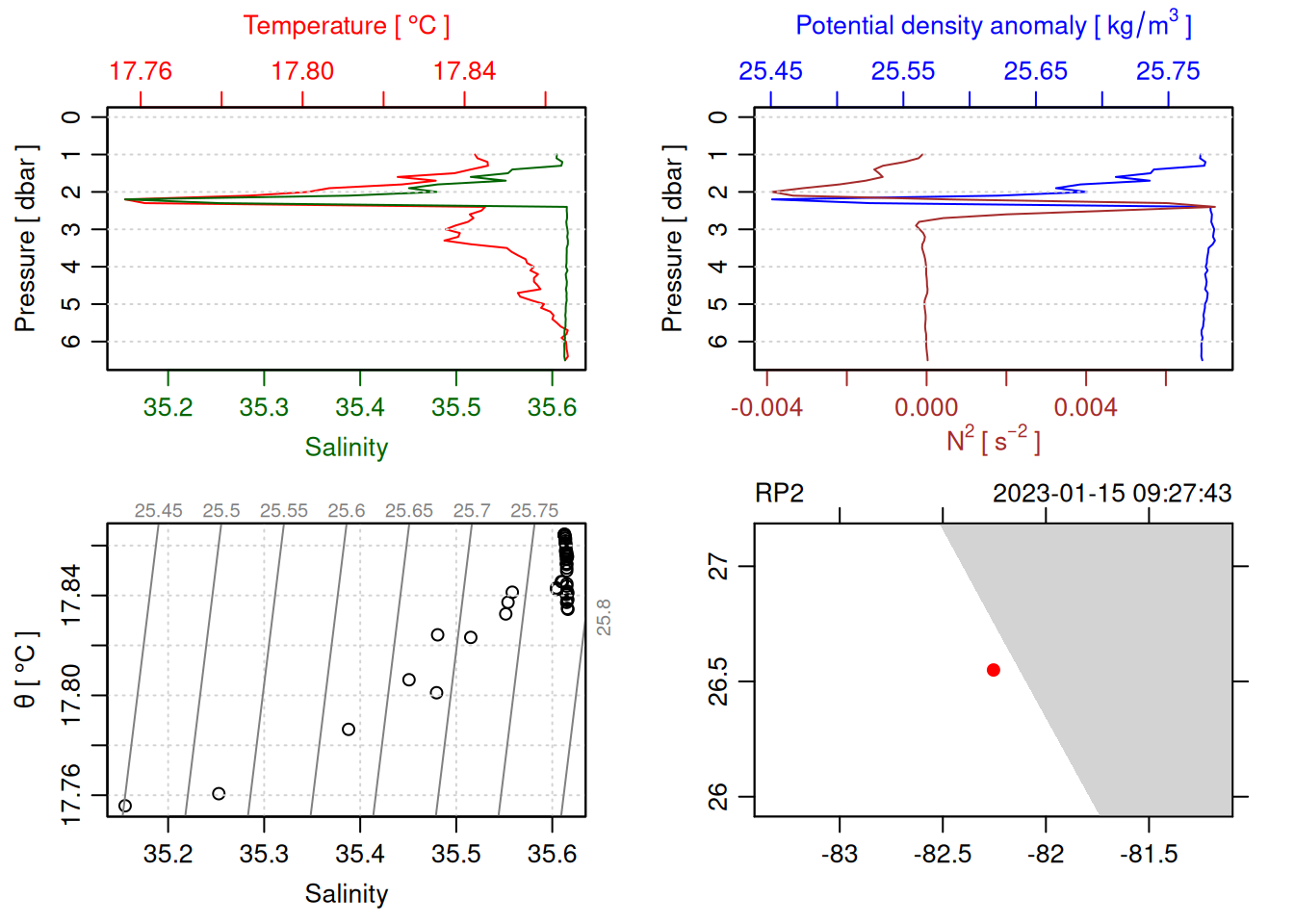 tryCatch({ trimmed_cast <-ctdTrim(cast) decimated_cast <-ctdDecimate(trimmed_cast, p =0.1)# plotting can cause the xlim failureplot(decimated_cast)# === export ===# Get the scan numbers that remain after cleaning cleaned_scans <- decimated_cast@data$scan# Load original raw data to keep all columns ctd_raw <- readr::read_csv(dataFile, show_col_types =FALSE)# Filter raw data to only include the cleaned scans cast_df <- ctd_raw %>%filter(!is.na(sea_water_pressure)) %>%# Remove rows without pressure datamutate(row_num =row_number()) %>%filter(row_num %in% cleaned_scans) %>%select(-row_num)# Add metadata cast_df <-mutate( cast_df,station = station_id,cruise_id = cruise_id )# Check if there are any rows in the cleaned dataif (nrow(cast_df) ==0) {cat("\n=== WARNING: NO DATA AFTER CLEANING ===\n")cat("Cast ID:", params$cast_id, "\n")cat("Station:", station_id, "\n")cat("Cruise:", cruise_id, "\n\n")cat("Raw data rows (with pressure):", sum(!is.na(ctd_raw$sea_water_pressure)), "\n")cat("Cleaned scans to keep:", length(cleaned_scans), "\n")cat("Resulting rows:", nrow(cast_df), "\n\n")cat("Raw data summary:\n")print(summary(ctd_raw[c("sea_water_pressure", "sea_water_temperature", "sea_water_salinity")]))cat("\nCleaned scans (first 20):\n")print(head(cleaned_scans, 20))cat("\n=== CSV FILE NOT CREATED (no data) ===\n\n") } else {# create folder if doesn't exist clean_data_loc <- here::here("data/02_clean")try(fs::dir_create(clean_data_loc))# save ctd to .csv (without row names/indices)write.csv(cast_df, glue("{clean_data_loc}/{params$cast_id}.csv"), row.names =FALSE)cat("Successfully saved", nrow(cast_df), "rows to", glue("{params$cast_id}.csv"), "\n") }}, error =function(e) {cat("\n=== CTD PROCESSING ERROR ===\n")cat("Cast ID:", params$cast_id, "\n")cat("Error message:\n", conditionMessage(e), "\n\n")# Safely inspect objects that might or might not exist when the error happenedif (exists("decimated_cast")) { df <-try(as.data.frame(decimated_cast@data), silent =TRUE)if (!inherits(df, "try-error")) {cat("Dataframe columns:\n")print(names(df))cat("\nSummary of key columns (scan, pressure, temperature, salinity if present):\n") known_cols <-intersect(c("scan", "pressure", "temp", "temperature", "salinity", "conductivity"), names(df))print(summary(df[known_cols], digits =3))cat("\nHead of dataframe:\n")print(head(df)) } else {cat("Could not extract dataframe from decimated_cast.\n") } } else {cat("decimated_cast was never created before the error.\n") }cat("\n=== END ERROR DEBUG INFO ===\n\n")})