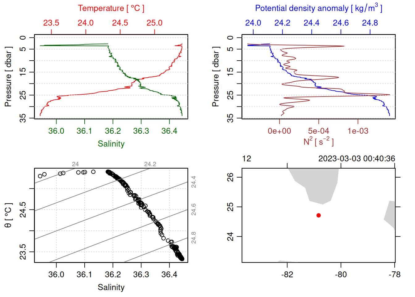 tryCatch({ trimmed_cast <-ctdTrim(cast) decimated_cast <-ctdDecimate(trimmed_cast, p =0.1)# plotting can cause the xlim failureplot(decimated_cast)# === export ===# Get the scan numbers that remain after cleaning cleaned_scans <- decimated_cast@data$scan# Load original raw data to keep all columns ctd_raw <- readr::read_csv(dataFile, show_col_types =FALSE)# Filter raw data to only include the cleaned scans cast_df <- ctd_raw %>%filter(!is.na(sea_water_pressure)) %>%# Remove rows without pressure datamutate(row_num =row_number()) %>%filter(row_num %in% cleaned_scans) %>%select(-row_num)# Add metadata cast_df <-mutate( cast_df,station = station_id,cruise_id = cruise_id )# Check if there are any rows in the cleaned dataif (nrow(cast_df) ==0) {cat("\n=== WARNING: NO DATA AFTER CLEANING ===\n")cat("Cast ID:", params$cast_id, "\n")cat("Station:", station_id, "\n")cat("Cruise:", cruise_id, "\n\n")cat("Raw data rows (with pressure):", sum(!is.na(ctd_raw$sea_water_pressure)), "\n")cat("Cleaned scans to keep:", length(cleaned_scans), "\n")cat("Resulting rows:", nrow(cast_df), "\n\n")cat("Raw data summary:\n")print(summary(ctd_raw[c("sea_water_pressure", "sea_water_temperature", "sea_water_salinity")]))cat("\nCleaned scans (first 20):\n")print(head(cleaned_scans, 20))cat("\n=== CSV FILE NOT CREATED (no data) ===\n\n") } else {# create folder if doesn't exist clean_data_loc <- here::here("data/02_clean")try(fs::dir_create(clean_data_loc))# save ctd to .csv (without row names/indices)write.csv(cast_df, glue("{clean_data_loc}/{params$cast_id}.csv"), row.names =FALSE)cat("Successfully saved", nrow(cast_df), "rows to", glue("{params$cast_id}.csv"), "\n") }}, error =function(e) {cat("\n=== CTD PROCESSING ERROR ===\n")cat("Cast ID:", params$cast_id, "\n")cat("Error message:\n", conditionMessage(e), "\n\n")# Safely inspect objects that might or might not exist when the error happenedif (exists("decimated_cast")) { df <-try(as.data.frame(decimated_cast@data), silent =TRUE)if (!inherits(df, "try-error")) {cat("Dataframe columns:\n")print(names(df))cat("\nSummary of key columns (scan, pressure, temperature, salinity if present):\n") known_cols <-intersect(c("scan", "pressure", "temp", "temperature", "salinity", "conductivity"), names(df))print(summary(df[known_cols], digits =3))cat("\nHead of dataframe:\n")print(head(df)) } else {cat("Could not extract dataframe from decimated_cast.\n") } } else {cat("decimated_cast was never created before the error.\n") }cat("\n=== END ERROR DEBUG INFO ===\n\n")})