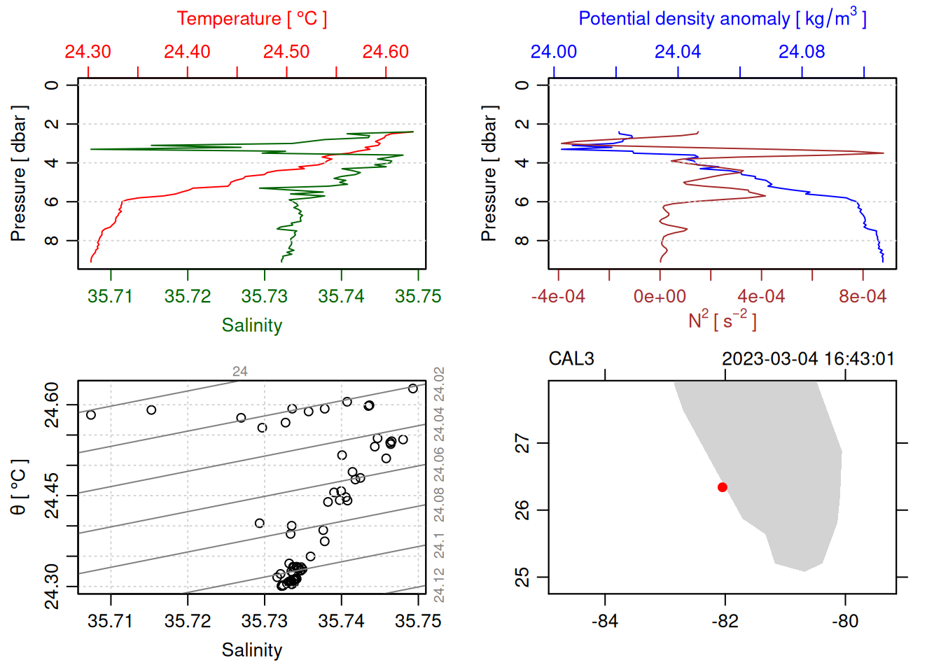 tryCatch({ trimmed_cast <-ctdTrim(cast) decimated_cast <-ctdDecimate(trimmed_cast, p =0.1)# plotting can cause the xlim failureplot(decimated_cast)# === export ===# Get the scan numbers that remain after cleaning cleaned_scans <- decimated_cast@data$scan# Load original raw data to keep all columns ctd_raw <- readr::read_csv(dataFile, show_col_types =FALSE)# Filter raw data to only include the cleaned scans cast_df <- ctd_raw %>%filter(!is.na(sea_water_pressure)) %>%# Remove rows without pressure datamutate(row_num =row_number()) %>%filter(row_num %in% cleaned_scans) %>%select(-row_num)# Add metadata cast_df <-mutate( cast_df,station = station_id,cruise_id = cruise_id )# Check if there are any rows in the cleaned dataif (nrow(cast_df) ==0) {cat("\n=== WARNING: NO DATA AFTER CLEANING ===\n")cat("Cast ID:", params$cast_id, "\n")cat("Station:", station_id, "\n")cat("Cruise:", cruise_id, "\n\n")cat("Raw data rows (with pressure):", sum(!is.na(ctd_raw$sea_water_pressure)), "\n")cat("Cleaned scans to keep:", length(cleaned_scans), "\n")cat("Resulting rows:", nrow(cast_df), "\n\n")cat("Raw data summary:\n")print(summary(ctd_raw[c("sea_water_pressure", "sea_water_temperature", "sea_water_salinity")]))cat("\nCleaned scans (first 20):\n")print(head(cleaned_scans, 20))cat("\n=== CSV FILE NOT CREATED (no data) ===\n\n") } else {# create folder if doesn't exist clean_data_loc <- here::here("data/02_clean")try(fs::dir_create(clean_data_loc))# save ctd to .csv (without row names/indices)write.csv(cast_df, glue("{clean_data_loc}/{params$cast_id}.csv"), row.names =FALSE)cat("Successfully saved", nrow(cast_df), "rows to", glue("{params$cast_id}.csv"), "\n") }}, error =function(e) {cat("\n=== CTD PROCESSING ERROR ===\n")cat("Cast ID:", params$cast_id, "\n")cat("Error message:\n", conditionMessage(e), "\n\n")# Safely inspect objects that might or might not exist when the error happenedif (exists("decimated_cast")) { df <-try(as.data.frame(decimated_cast@data), silent =TRUE)if (!inherits(df, "try-error")) {cat("Dataframe columns:\n")print(names(df))cat("\nSummary of key columns (scan, pressure, temperature, salinity if present):\n") known_cols <-intersect(c("scan", "pressure", "temp", "temperature", "salinity", "conductivity"), names(df))print(summary(df[known_cols], digits =3))cat("\nHead of dataframe:\n")print(head(df)) } else {cat("Could not extract dataframe from decimated_cast.\n") } } else {cat("decimated_cast was never created before the error.\n") }cat("\n=== END ERROR DEBUG INFO ===\n\n")})