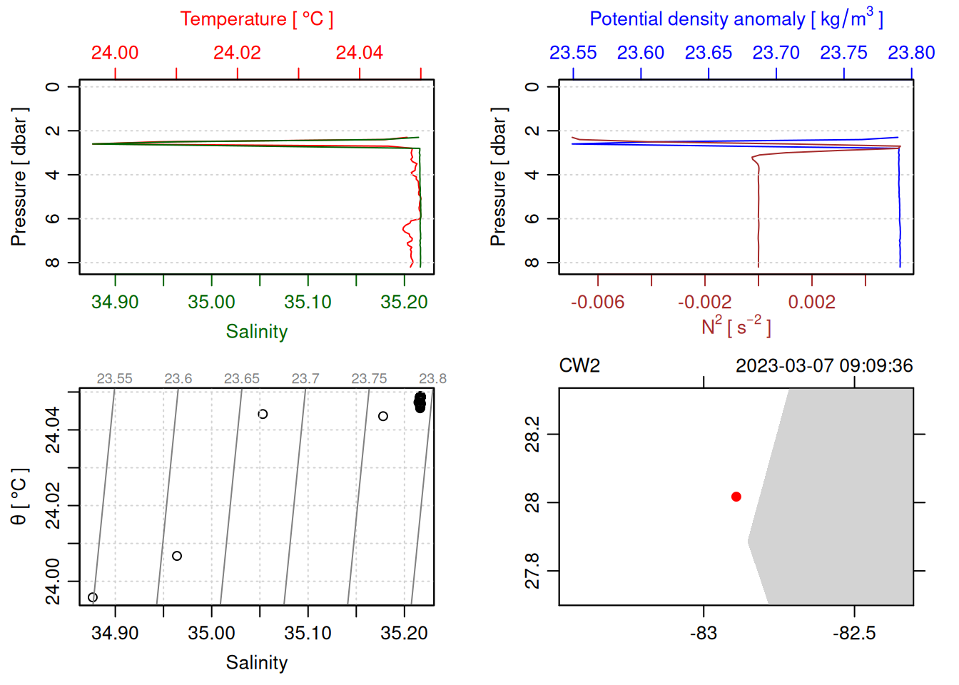 tryCatch({ trimmed_cast <-ctdTrim(cast) decimated_cast <-ctdDecimate(trimmed_cast, p =0.1)# plotting can cause the xlim failureplot(decimated_cast)# === export ===# Get the scan numbers that remain after cleaning cleaned_scans <- decimated_cast@data$scan# Load original raw data to keep all columns ctd_raw <- readr::read_csv(dataFile, show_col_types =FALSE)# Filter raw data to only include the cleaned scans cast_df <- ctd_raw %>%filter(!is.na(sea_water_pressure)) %>%# Remove rows without pressure datamutate(row_num =row_number()) %>%filter(row_num %in% cleaned_scans) %>%select(-row_num)# Add metadata cast_df <-mutate( cast_df,station = station_id,cruise_id = cruise_id )# Check if there are any rows in the cleaned dataif (nrow(cast_df) ==0) {cat("\n=== WARNING: NO DATA AFTER CLEANING ===\n")cat("Cast ID:", params$cast_id, "\n")cat("Station:", station_id, "\n")cat("Cruise:", cruise_id, "\n\n")cat("Raw data rows (with pressure):", sum(!is.na(ctd_raw$sea_water_pressure)), "\n")cat("Cleaned scans to keep:", length(cleaned_scans), "\n")cat("Resulting rows:", nrow(cast_df), "\n\n")cat("Raw data summary:\n")print(summary(ctd_raw[c("sea_water_pressure", "sea_water_temperature", "sea_water_salinity")]))cat("\nCleaned scans (first 20):\n")print(head(cleaned_scans, 20))cat("\n=== CSV FILE NOT CREATED (no data) ===\n\n") } else {# create folder if doesn't exist clean_data_loc <- here::here("data/02_clean")try(fs::dir_create(clean_data_loc))# save ctd to .csv (without row names/indices)write.csv(cast_df, glue("{clean_data_loc}/{params$cast_id}.csv"), row.names =FALSE)cat("Successfully saved", nrow(cast_df), "rows to", glue("{params$cast_id}.csv"), "\n") }}, error =function(e) {cat("\n=== CTD PROCESSING ERROR ===\n")cat("Cast ID:", params$cast_id, "\n")cat("Error message:\n", conditionMessage(e), "\n\n")# Safely inspect objects that might or might not exist when the error happenedif (exists("decimated_cast")) { df <-try(as.data.frame(decimated_cast@data), silent =TRUE)if (!inherits(df, "try-error")) {cat("Dataframe columns:\n")print(names(df))cat("\nSummary of key columns (scan, pressure, temperature, salinity if present):\n") known_cols <-intersect(c("scan", "pressure", "temp", "temperature", "salinity", "conductivity"), names(df))print(summary(df[known_cols], digits =3))cat("\nHead of dataframe:\n")print(head(df)) } else {cat("Could not extract dataframe from decimated_cast.\n") } } else {cat("decimated_cast was never created before the error.\n") }cat("\n=== END ERROR DEBUG INFO ===\n\n")})