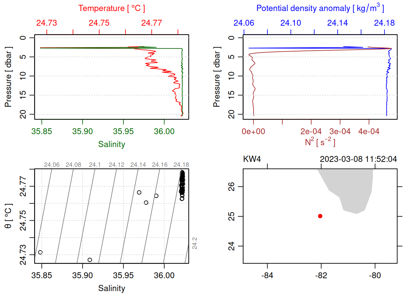 tryCatch({ trimmed_cast <-ctdTrim(cast) decimated_cast <-ctdDecimate(trimmed_cast, p =0.1)# plotting can cause the xlim failureplot(decimated_cast)# === export ===# Get the scan numbers that remain after cleaning cleaned_scans <- decimated_cast@data$scan# Load original raw data to keep all columns ctd_raw <- readr::read_csv(dataFile, show_col_types =FALSE)# Filter raw data to only include the cleaned scans cast_df <- ctd_raw %>%filter(!is.na(sea_water_pressure)) %>%# Remove rows without pressure datamutate(row_num =row_number()) %>%filter(row_num %in% cleaned_scans) %>%select(-row_num)# Add metadata cast_df <-mutate( cast_df,station = station_id,cruise_id = cruise_id )# Check if there are any rows in the cleaned dataif (nrow(cast_df) ==0) {cat("\n=== WARNING: NO DATA AFTER CLEANING ===\n")cat("Cast ID:", params$cast_id, "\n")cat("Station:", station_id, "\n")cat("Cruise:", cruise_id, "\n\n")cat("Raw data rows (with pressure):", sum(!is.na(ctd_raw$sea_water_pressure)), "\n")cat("Cleaned scans to keep:", length(cleaned_scans), "\n")cat("Resulting rows:", nrow(cast_df), "\n\n")cat("Raw data summary:\n")print(summary(ctd_raw[c("sea_water_pressure", "sea_water_temperature", "sea_water_salinity")]))cat("\nCleaned scans (first 20):\n")print(head(cleaned_scans, 20))cat("\n=== CSV FILE NOT CREATED (no data) ===\n\n") } else {# create folder if doesn't exist clean_data_loc <- here::here("data/02_clean")try(fs::dir_create(clean_data_loc))# save ctd to .csv (without row names/indices)write.csv(cast_df, glue("{clean_data_loc}/{params$cast_id}.csv"), row.names =FALSE)cat("Successfully saved", nrow(cast_df), "rows to", glue("{params$cast_id}.csv"), "\n") }}, error =function(e) {cat("\n=== CTD PROCESSING ERROR ===\n")cat("Cast ID:", params$cast_id, "\n")cat("Error message:\n", conditionMessage(e), "\n\n")# Safely inspect objects that might or might not exist when the error happenedif (exists("decimated_cast")) { df <-try(as.data.frame(decimated_cast@data), silent =TRUE)if (!inherits(df, "try-error")) {cat("Dataframe columns:\n")print(names(df))cat("\nSummary of key columns (scan, pressure, temperature, salinity if present):\n") known_cols <-intersect(c("scan", "pressure", "temp", "temperature", "salinity", "conductivity"), names(df))print(summary(df[known_cols], digits =3))cat("\nHead of dataframe:\n")print(head(df)) } else {cat("Could not extract dataframe from decimated_cast.\n") } } else {cat("decimated_cast was never created before the error.\n") }cat("\n=== END ERROR DEBUG INFO ===\n\n")})