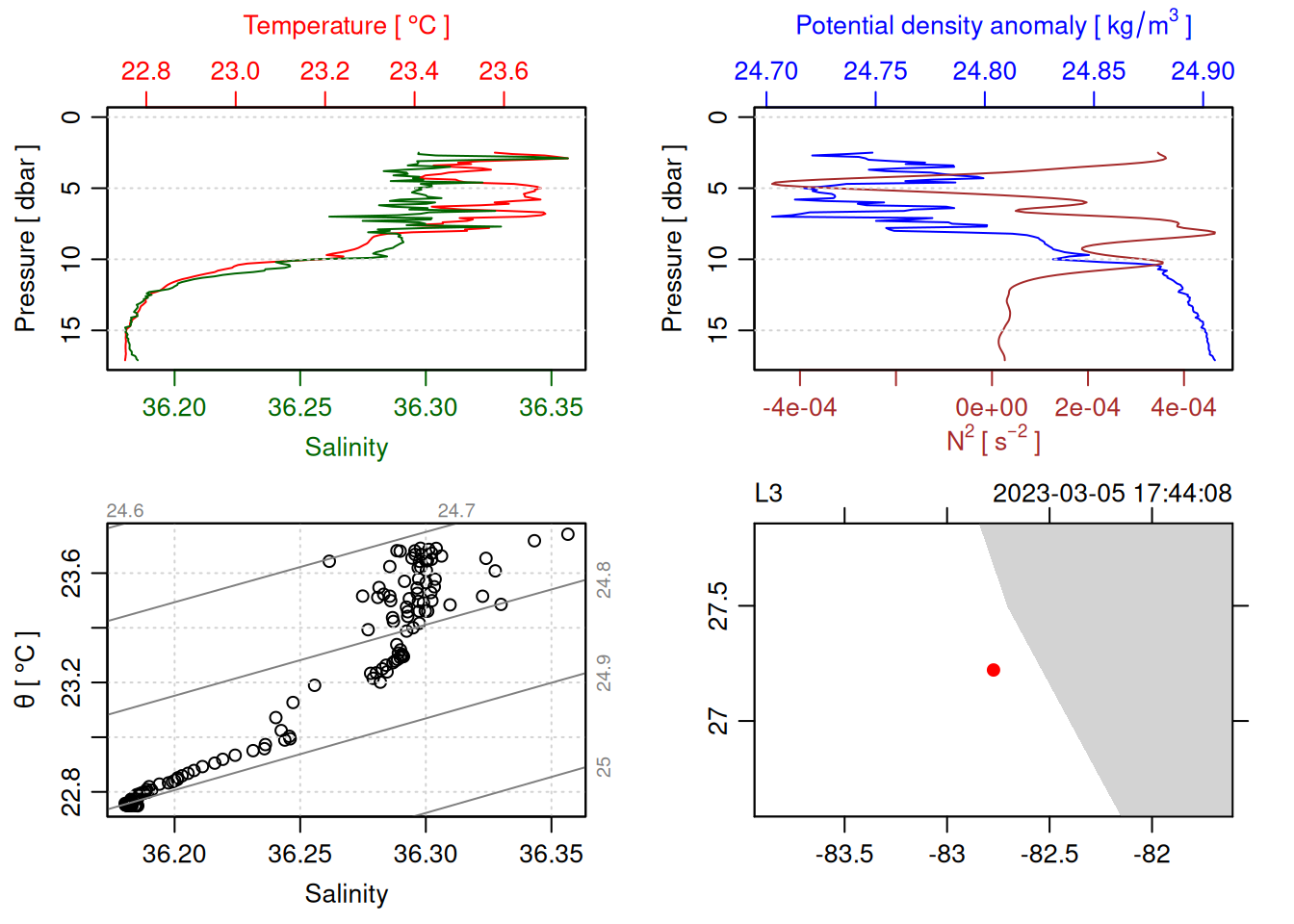 tryCatch({ trimmed_cast <-ctdTrim(cast) decimated_cast <-ctdDecimate(trimmed_cast, p =0.1)# plotting can cause the xlim failureplot(decimated_cast)# === export ===# Get the scan numbers that remain after cleaning cleaned_scans <- decimated_cast@data$scan# Load original raw data to keep all columns ctd_raw <- readr::read_csv(dataFile, show_col_types =FALSE)# Filter raw data to only include the cleaned scans cast_df <- ctd_raw %>%filter(!is.na(sea_water_pressure)) %>%# Remove rows without pressure datamutate(row_num =row_number()) %>%filter(row_num %in% cleaned_scans) %>%select(-row_num)# Add metadata cast_df <-mutate( cast_df,station = station_id,cruise_id = cruise_id )# Check if there are any rows in the cleaned dataif (nrow(cast_df) ==0) {cat("\n=== WARNING: NO DATA AFTER CLEANING ===\n")cat("Cast ID:", params$cast_id, "\n")cat("Station:", station_id, "\n")cat("Cruise:", cruise_id, "\n\n")cat("Raw data rows (with pressure):", sum(!is.na(ctd_raw$sea_water_pressure)), "\n")cat("Cleaned scans to keep:", length(cleaned_scans), "\n")cat("Resulting rows:", nrow(cast_df), "\n\n")cat("Raw data summary:\n")print(summary(ctd_raw[c("sea_water_pressure", "sea_water_temperature", "sea_water_salinity")]))cat("\nCleaned scans (first 20):\n")print(head(cleaned_scans, 20))cat("\n=== CSV FILE NOT CREATED (no data) ===\n\n") } else {# create folder if doesn't exist clean_data_loc <- here::here("data/02_clean")try(fs::dir_create(clean_data_loc))# save ctd to .csv (without row names/indices)write.csv(cast_df, glue("{clean_data_loc}/{params$cast_id}.csv"), row.names =FALSE)cat("Successfully saved", nrow(cast_df), "rows to", glue("{params$cast_id}.csv"), "\n") }}, error =function(e) {cat("\n=== CTD PROCESSING ERROR ===\n")cat("Cast ID:", params$cast_id, "\n")cat("Error message:\n", conditionMessage(e), "\n\n")# Safely inspect objects that might or might not exist when the error happenedif (exists("decimated_cast")) { df <-try(as.data.frame(decimated_cast@data), silent =TRUE)if (!inherits(df, "try-error")) {cat("Dataframe columns:\n")print(names(df))cat("\nSummary of key columns (scan, pressure, temperature, salinity if present):\n") known_cols <-intersect(c("scan", "pressure", "temp", "temperature", "salinity", "conductivity"), names(df))print(summary(df[known_cols], digits =3))cat("\nHead of dataframe:\n")print(head(df)) } else {cat("Could not extract dataframe from decimated_cast.\n") } } else {cat("decimated_cast was never created before the error.\n") }cat("\n=== END ERROR DEBUG INFO ===\n\n")})