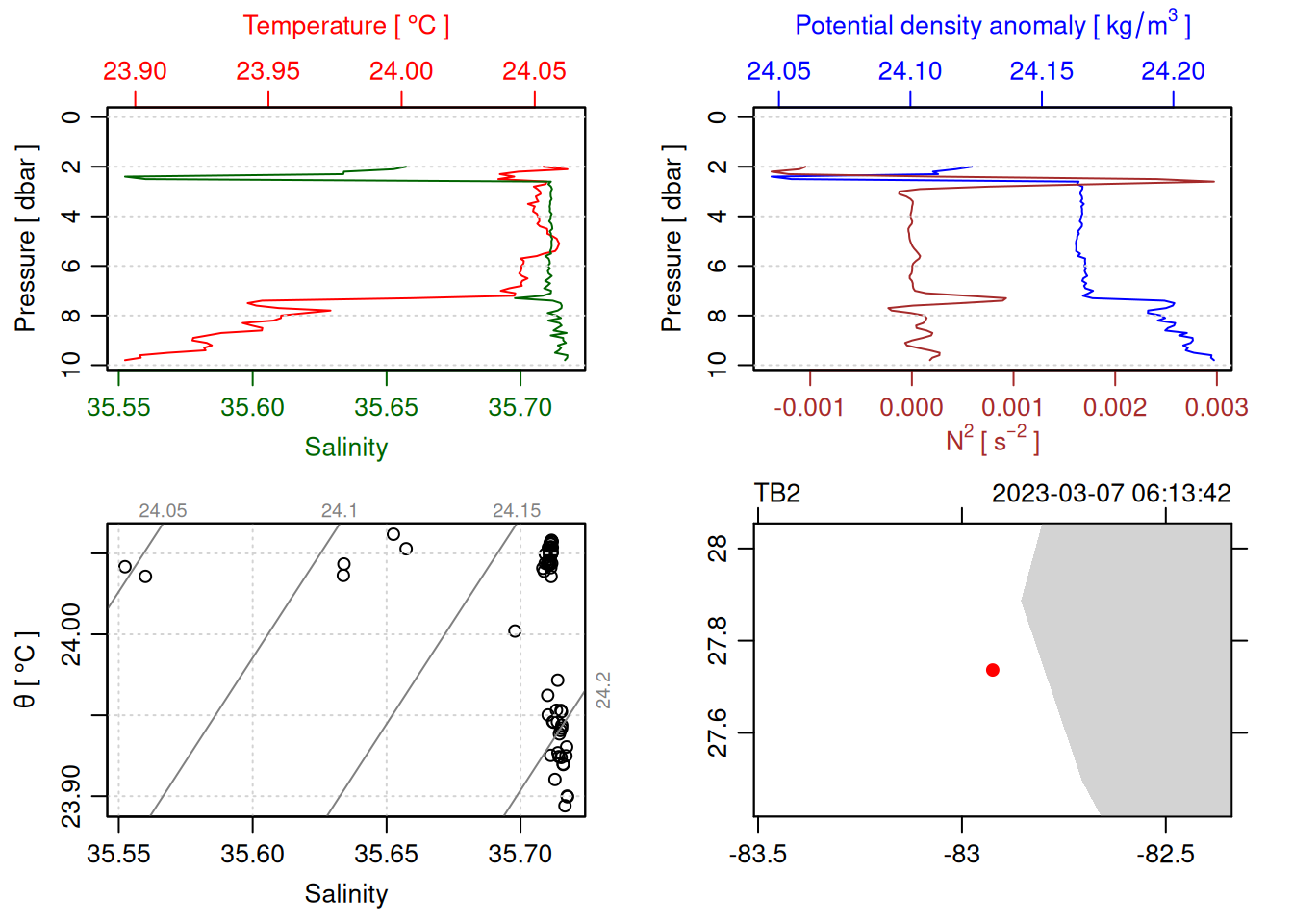 tryCatch({ trimmed_cast <-ctdTrim(cast) decimated_cast <-ctdDecimate(trimmed_cast, p =0.1)# plotting can cause the xlim failureplot(decimated_cast)# === export ===# Get the scan numbers that remain after cleaning cleaned_scans <- decimated_cast@data$scan# Load original raw data to keep all columns ctd_raw <- readr::read_csv(dataFile, show_col_types =FALSE)# Filter raw data to only include the cleaned scans cast_df <- ctd_raw %>%filter(!is.na(sea_water_pressure)) %>%# Remove rows without pressure datamutate(row_num =row_number()) %>%filter(row_num %in% cleaned_scans) %>%select(-row_num)# Add metadata cast_df <-mutate( cast_df,station = station_id,cruise_id = cruise_id )# Check if there are any rows in the cleaned dataif (nrow(cast_df) ==0) {cat("\n=== WARNING: NO DATA AFTER CLEANING ===\n")cat("Cast ID:", params$cast_id, "\n")cat("Station:", station_id, "\n")cat("Cruise:", cruise_id, "\n\n")cat("Raw data rows (with pressure):", sum(!is.na(ctd_raw$sea_water_pressure)), "\n")cat("Cleaned scans to keep:", length(cleaned_scans), "\n")cat("Resulting rows:", nrow(cast_df), "\n\n")cat("Raw data summary:\n")print(summary(ctd_raw[c("sea_water_pressure", "sea_water_temperature", "sea_water_salinity")]))cat("\nCleaned scans (first 20):\n")print(head(cleaned_scans, 20))cat("\n=== CSV FILE NOT CREATED (no data) ===\n\n") } else {# create folder if doesn't exist clean_data_loc <- here::here("data/02_clean")try(fs::dir_create(clean_data_loc))# save ctd to .csv (without row names/indices)write.csv(cast_df, glue("{clean_data_loc}/{params$cast_id}.csv"), row.names =FALSE)cat("Successfully saved", nrow(cast_df), "rows to", glue("{params$cast_id}.csv"), "\n") }}, error =function(e) {cat("\n=== CTD PROCESSING ERROR ===\n")cat("Cast ID:", params$cast_id, "\n")cat("Error message:\n", conditionMessage(e), "\n\n")# Safely inspect objects that might or might not exist when the error happenedif (exists("decimated_cast")) { df <-try(as.data.frame(decimated_cast@data), silent =TRUE)if (!inherits(df, "try-error")) {cat("Dataframe columns:\n")print(names(df))cat("\nSummary of key columns (scan, pressure, temperature, salinity if present):\n") known_cols <-intersect(c("scan", "pressure", "temp", "temperature", "salinity", "conductivity"), names(df))print(summary(df[known_cols], digits =3))cat("\nHead of dataframe:\n")print(head(df)) } else {cat("Could not extract dataframe from decimated_cast.\n") } } else {cat("decimated_cast was never created before the error.\n") }cat("\n=== END ERROR DEBUG INFO ===\n\n")})
