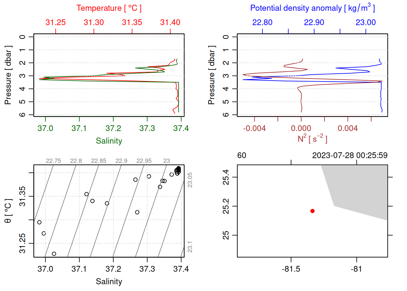 tryCatch({ trimmed_cast <-ctdTrim(cast) decimated_cast <-ctdDecimate(trimmed_cast, p =0.1)# plotting can cause the xlim failureplot(decimated_cast)# === export ===# Get the scan numbers that remain after cleaning cleaned_scans <- decimated_cast@data$scan# Load original raw data to keep all columns ctd_raw <- readr::read_csv(dataFile, show_col_types =FALSE)# Filter raw data to only include the cleaned scans cast_df <- ctd_raw %>%filter(!is.na(sea_water_pressure)) %>%# Remove rows without pressure datamutate(row_num =row_number()) %>%filter(row_num %in% cleaned_scans) %>%select(-row_num)# Add metadata cast_df <-mutate( cast_df,station = station_id,cruise_id = cruise_id )# Check if there are any rows in the cleaned dataif (nrow(cast_df) ==0) {cat("\n=== WARNING: NO DATA AFTER CLEANING ===\n")cat("Cast ID:", params$cast_id, "\n")cat("Station:", station_id, "\n")cat("Cruise:", cruise_id, "\n\n")cat("Raw data rows (with pressure):", sum(!is.na(ctd_raw$sea_water_pressure)), "\n")cat("Cleaned scans to keep:", length(cleaned_scans), "\n")cat("Resulting rows:", nrow(cast_df), "\n\n")cat("Raw data summary:\n")print(summary(ctd_raw[c("sea_water_pressure", "sea_water_temperature", "sea_water_salinity")]))cat("\nCleaned scans (first 20):\n")print(head(cleaned_scans, 20))cat("\n=== CSV FILE NOT CREATED (no data) ===\n\n") } else {# create folder if doesn't exist clean_data_loc <- here::here("data/02_clean")try(fs::dir_create(clean_data_loc))# save ctd to .csv (without row names/indices)write.csv(cast_df, glue("{clean_data_loc}/{params$cast_id}.csv"), row.names =FALSE)cat("Successfully saved", nrow(cast_df), "rows to", glue("{params$cast_id}.csv"), "\n") }}, error =function(e) {cat("\n=== CTD PROCESSING ERROR ===\n")cat("Cast ID:", params$cast_id, "\n")cat("Error message:\n", conditionMessage(e), "\n\n")# Safely inspect objects that might or might not exist when the error happenedif (exists("decimated_cast")) { df <-try(as.data.frame(decimated_cast@data), silent =TRUE)if (!inherits(df, "try-error")) {cat("Dataframe columns:\n")print(names(df))cat("\nSummary of key columns (scan, pressure, temperature, salinity if present):\n") known_cols <-intersect(c("scan", "pressure", "temp", "temperature", "salinity", "conductivity"), names(df))print(summary(df[known_cols], digits =3))cat("\nHead of dataframe:\n")print(head(df)) } else {cat("Could not extract dataframe from decimated_cast.\n") } } else {cat("decimated_cast was never created before the error.\n") }cat("\n=== END ERROR DEBUG INFO ===\n\n")})