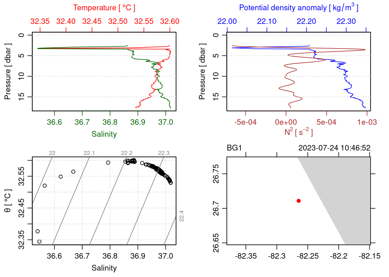 tryCatch({ trimmed_cast <-ctdTrim(cast) decimated_cast <-ctdDecimate(trimmed_cast, p =0.1)# plotting can cause the xlim failureplot(decimated_cast)# === export ===# Get the scan numbers that remain after cleaning cleaned_scans <- decimated_cast@data$scan# Load original raw data to keep all columns ctd_raw <- readr::read_csv(dataFile, show_col_types =FALSE)# Filter raw data to only include the cleaned scans cast_df <- ctd_raw %>%filter(!is.na(sea_water_pressure)) %>%# Remove rows without pressure datamutate(row_num =row_number()) %>%filter(row_num %in% cleaned_scans) %>%select(-row_num)# Add metadata cast_df <-mutate( cast_df,station = station_id,cruise_id = cruise_id )# Check if there are any rows in the cleaned dataif (nrow(cast_df) ==0) {cat("\n=== WARNING: NO DATA AFTER CLEANING ===\n")cat("Cast ID:", params$cast_id, "\n")cat("Station:", station_id, "\n")cat("Cruise:", cruise_id, "\n\n")cat("Raw data rows (with pressure):", sum(!is.na(ctd_raw$sea_water_pressure)), "\n")cat("Cleaned scans to keep:", length(cleaned_scans), "\n")cat("Resulting rows:", nrow(cast_df), "\n\n")cat("Raw data summary:\n")print(summary(ctd_raw[c("sea_water_pressure", "sea_water_temperature", "sea_water_salinity")]))cat("\nCleaned scans (first 20):\n")print(head(cleaned_scans, 20))cat("\n=== CSV FILE NOT CREATED (no data) ===\n\n") } else {# create folder if doesn't exist clean_data_loc <- here::here("data/02_clean")try(fs::dir_create(clean_data_loc))# save ctd to .csv (without row names/indices)write.csv(cast_df, glue("{clean_data_loc}/{params$cast_id}.csv"), row.names =FALSE)cat("Successfully saved", nrow(cast_df), "rows to", glue("{params$cast_id}.csv"), "\n") }}, error =function(e) {cat("\n=== CTD PROCESSING ERROR ===\n")cat("Cast ID:", params$cast_id, "\n")cat("Error message:\n", conditionMessage(e), "\n\n")# Safely inspect objects that might or might not exist when the error happenedif (exists("decimated_cast")) { df <-try(as.data.frame(decimated_cast@data), silent =TRUE)if (!inherits(df, "try-error")) {cat("Dataframe columns:\n")print(names(df))cat("\nSummary of key columns (scan, pressure, temperature, salinity if present):\n") known_cols <-intersect(c("scan", "pressure", "temp", "temperature", "salinity", "conductivity"), names(df))print(summary(df[known_cols], digits =3))cat("\nHead of dataframe:\n")print(head(df)) } else {cat("Could not extract dataframe from decimated_cast.\n") } } else {cat("decimated_cast was never created before the error.\n") }cat("\n=== END ERROR DEBUG INFO ===\n\n")})