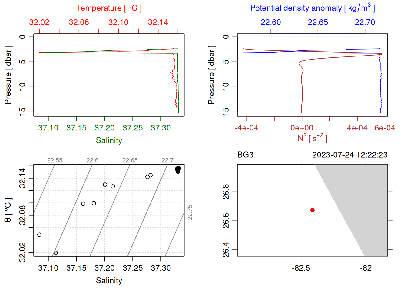 tryCatch({ trimmed_cast <-ctdTrim(cast) decimated_cast <-ctdDecimate(trimmed_cast, p =0.1)# plotting can cause the xlim failureplot(decimated_cast)# === export ===# Get the scan numbers that remain after cleaning cleaned_scans <- decimated_cast@data$scan# Load original raw data to keep all columns ctd_raw <- readr::read_csv(dataFile, show_col_types =FALSE)# Filter raw data to only include the cleaned scans cast_df <- ctd_raw %>%filter(!is.na(sea_water_pressure)) %>%# Remove rows without pressure datamutate(row_num =row_number()) %>%filter(row_num %in% cleaned_scans) %>%select(-row_num)# Add metadata cast_df <-mutate( cast_df,station = station_id,cruise_id = cruise_id )# Check if there are any rows in the cleaned dataif (nrow(cast_df) ==0) {cat("\n=== WARNING: NO DATA AFTER CLEANING ===\n")cat("Cast ID:", params$cast_id, "\n")cat("Station:", station_id, "\n")cat("Cruise:", cruise_id, "\n\n")cat("Raw data rows (with pressure):", sum(!is.na(ctd_raw$sea_water_pressure)), "\n")cat("Cleaned scans to keep:", length(cleaned_scans), "\n")cat("Resulting rows:", nrow(cast_df), "\n\n")cat("Raw data summary:\n")print(summary(ctd_raw[c("sea_water_pressure", "sea_water_temperature", "sea_water_salinity")]))cat("\nCleaned scans (first 20):\n")print(head(cleaned_scans, 20))cat("\n=== CSV FILE NOT CREATED (no data) ===\n\n") } else {# create folder if doesn't exist clean_data_loc <- here::here("data/02_clean")try(fs::dir_create(clean_data_loc))# save ctd to .csv (without row names/indices)write.csv(cast_df, glue("{clean_data_loc}/{params$cast_id}.csv"), row.names =FALSE)cat("Successfully saved", nrow(cast_df), "rows to", glue("{params$cast_id}.csv"), "\n") }}, error =function(e) {cat("\n=== CTD PROCESSING ERROR ===\n")cat("Cast ID:", params$cast_id, "\n")cat("Error message:\n", conditionMessage(e), "\n\n")# Safely inspect objects that might or might not exist when the error happenedif (exists("decimated_cast")) { df <-try(as.data.frame(decimated_cast@data), silent =TRUE)if (!inherits(df, "try-error")) {cat("Dataframe columns:\n")print(names(df))cat("\nSummary of key columns (scan, pressure, temperature, salinity if present):\n") known_cols <-intersect(c("scan", "pressure", "temp", "temperature", "salinity", "conductivity"), names(df))print(summary(df[known_cols], digits =3))cat("\nHead of dataframe:\n")print(head(df)) } else {cat("Could not extract dataframe from decimated_cast.\n") } } else {cat("decimated_cast was never created before the error.\n") }cat("\n=== END ERROR DEBUG INFO ===\n\n")})