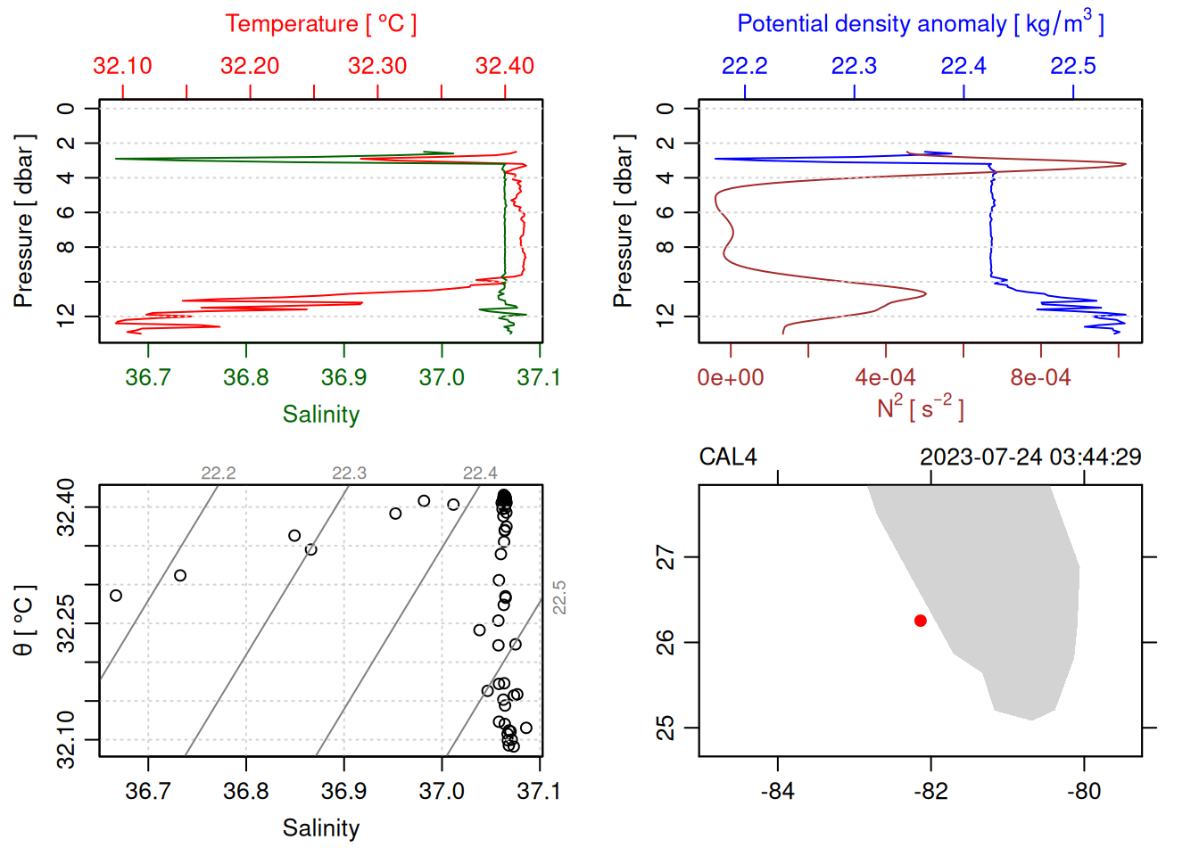 tryCatch({ trimmed_cast <-ctdTrim(cast) decimated_cast <-ctdDecimate(trimmed_cast, p =0.1)# plotting can cause the xlim failureplot(decimated_cast)# === export ===# Get the scan numbers that remain after cleaning cleaned_scans <- decimated_cast@data$scan# Load original raw data to keep all columns ctd_raw <- readr::read_csv(dataFile, show_col_types =FALSE)# Filter raw data to only include the cleaned scans cast_df <- ctd_raw %>%filter(!is.na(sea_water_pressure)) %>%# Remove rows without pressure datamutate(row_num =row_number()) %>%filter(row_num %in% cleaned_scans) %>%select(-row_num)# Add metadata cast_df <-mutate( cast_df,station = station_id,cruise_id = cruise_id )# Check if there are any rows in the cleaned dataif (nrow(cast_df) ==0) {cat("\n=== WARNING: NO DATA AFTER CLEANING ===\n")cat("Cast ID:", params$cast_id, "\n")cat("Station:", station_id, "\n")cat("Cruise:", cruise_id, "\n\n")cat("Raw data rows (with pressure):", sum(!is.na(ctd_raw$sea_water_pressure)), "\n")cat("Cleaned scans to keep:", length(cleaned_scans), "\n")cat("Resulting rows:", nrow(cast_df), "\n\n")cat("Raw data summary:\n")print(summary(ctd_raw[c("sea_water_pressure", "sea_water_temperature", "sea_water_salinity")]))cat("\nCleaned scans (first 20):\n")print(head(cleaned_scans, 20))cat("\n=== CSV FILE NOT CREATED (no data) ===\n\n") } else {# create folder if doesn't exist clean_data_loc <- here::here("data/02_clean")try(fs::dir_create(clean_data_loc))# save ctd to .csv (without row names/indices)write.csv(cast_df, glue("{clean_data_loc}/{params$cast_id}.csv"), row.names =FALSE)cat("Successfully saved", nrow(cast_df), "rows to", glue("{params$cast_id}.csv"), "\n") }}, error =function(e) {cat("\n=== CTD PROCESSING ERROR ===\n")cat("Cast ID:", params$cast_id, "\n")cat("Error message:\n", conditionMessage(e), "\n\n")# Safely inspect objects that might or might not exist when the error happenedif (exists("decimated_cast")) { df <-try(as.data.frame(decimated_cast@data), silent =TRUE)if (!inherits(df, "try-error")) {cat("Dataframe columns:\n")print(names(df))cat("\nSummary of key columns (scan, pressure, temperature, salinity if present):\n") known_cols <-intersect(c("scan", "pressure", "temp", "temperature", "salinity", "conductivity"), names(df))print(summary(df[known_cols], digits =3))cat("\nHead of dataframe:\n")print(head(df)) } else {cat("Could not extract dataframe from decimated_cast.\n") } } else {cat("decimated_cast was never created before the error.\n") }cat("\n=== END ERROR DEBUG INFO ===\n\n")})