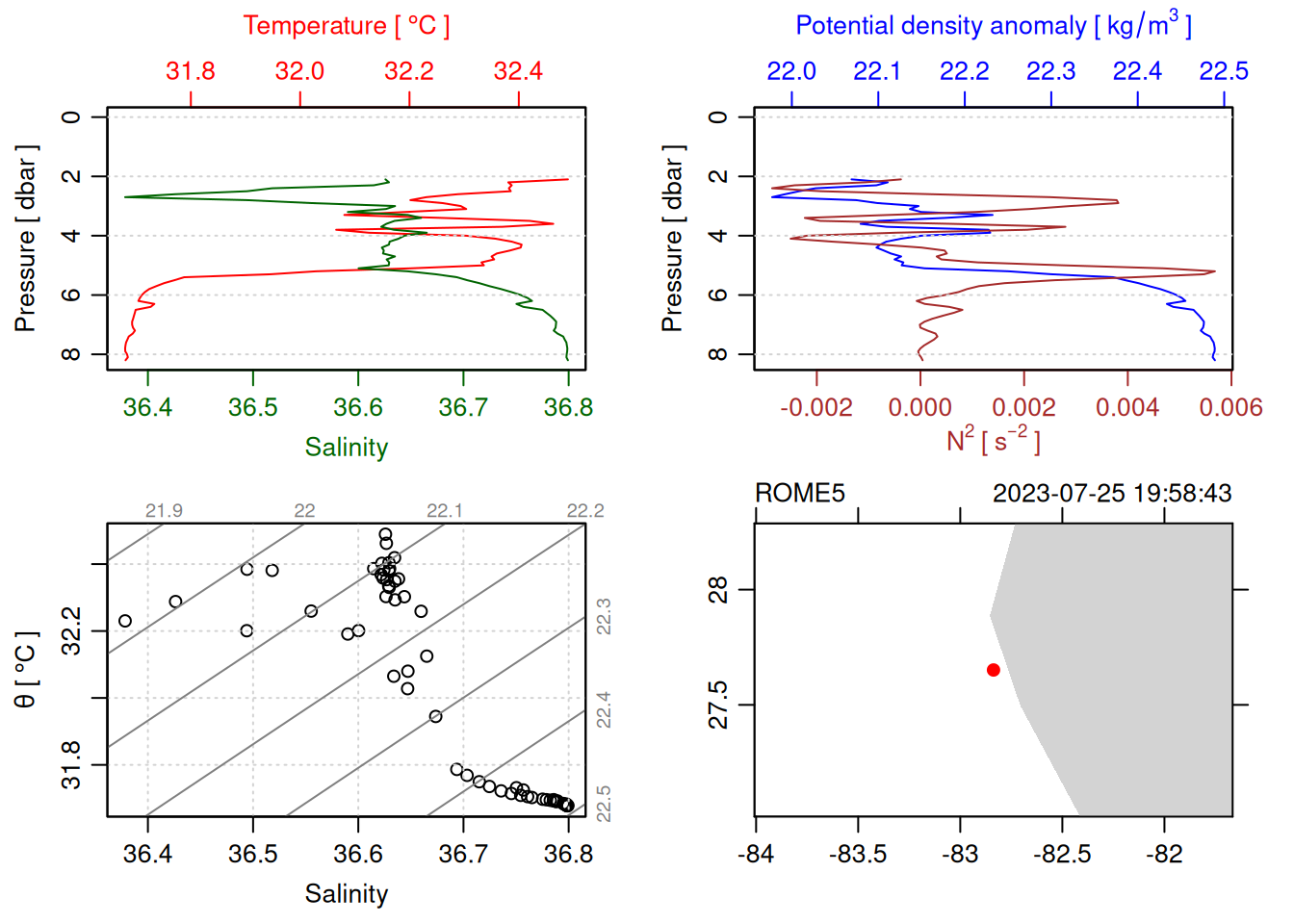 tryCatch({ trimmed_cast <-ctdTrim(cast) decimated_cast <-ctdDecimate(trimmed_cast, p =0.1)# plotting can cause the xlim failureplot(decimated_cast)# === export ===# Get the scan numbers that remain after cleaning cleaned_scans <- decimated_cast@data$scan# Load original raw data to keep all columns ctd_raw <- readr::read_csv(dataFile, show_col_types =FALSE)# Filter raw data to only include the cleaned scans cast_df <- ctd_raw %>%filter(!is.na(sea_water_pressure)) %>%# Remove rows without pressure datamutate(row_num =row_number()) %>%filter(row_num %in% cleaned_scans) %>%select(-row_num)# Add metadata cast_df <-mutate( cast_df,station = station_id,cruise_id = cruise_id )# Check if there are any rows in the cleaned dataif (nrow(cast_df) ==0) {cat("\n=== WARNING: NO DATA AFTER CLEANING ===\n")cat("Cast ID:", params$cast_id, "\n")cat("Station:", station_id, "\n")cat("Cruise:", cruise_id, "\n\n")cat("Raw data rows (with pressure):", sum(!is.na(ctd_raw$sea_water_pressure)), "\n")cat("Cleaned scans to keep:", length(cleaned_scans), "\n")cat("Resulting rows:", nrow(cast_df), "\n\n")cat("Raw data summary:\n")print(summary(ctd_raw[c("sea_water_pressure", "sea_water_temperature", "sea_water_salinity")]))cat("\nCleaned scans (first 20):\n")print(head(cleaned_scans, 20))cat("\n=== CSV FILE NOT CREATED (no data) ===\n\n") } else {# create folder if doesn't exist clean_data_loc <- here::here("data/02_clean")try(fs::dir_create(clean_data_loc))# save ctd to .csv (without row names/indices)write.csv(cast_df, glue("{clean_data_loc}/{params$cast_id}.csv"), row.names =FALSE)cat("Successfully saved", nrow(cast_df), "rows to", glue("{params$cast_id}.csv"), "\n") }}, error =function(e) {cat("\n=== CTD PROCESSING ERROR ===\n")cat("Cast ID:", params$cast_id, "\n")cat("Error message:\n", conditionMessage(e), "\n\n")# Safely inspect objects that might or might not exist when the error happenedif (exists("decimated_cast")) { df <-try(as.data.frame(decimated_cast@data), silent =TRUE)if (!inherits(df, "try-error")) {cat("Dataframe columns:\n")print(names(df))cat("\nSummary of key columns (scan, pressure, temperature, salinity if present):\n") known_cols <-intersect(c("scan", "pressure", "temp", "temperature", "salinity", "conductivity"), names(df))print(summary(df[known_cols], digits =3))cat("\nHead of dataframe:\n")print(head(df)) } else {cat("Could not extract dataframe from decimated_cast.\n") } } else {cat("decimated_cast was never created before the error.\n") }cat("\n=== END ERROR DEBUG INFO ===\n\n")})