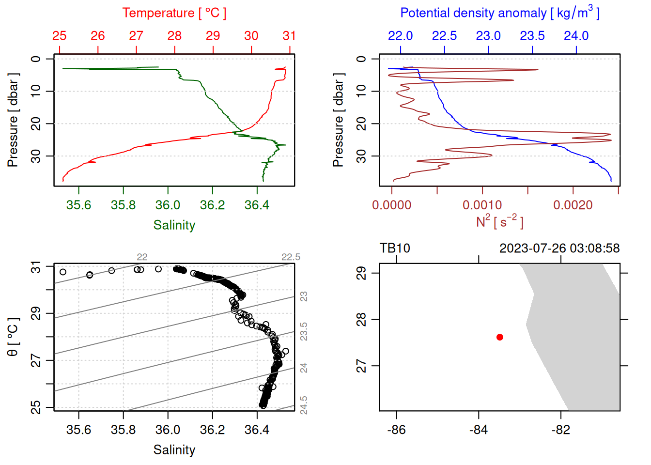 tryCatch({ trimmed_cast <-ctdTrim(cast) decimated_cast <-ctdDecimate(trimmed_cast, p =0.1)# plotting can cause the xlim failureplot(decimated_cast)# === export ===# Get the scan numbers that remain after cleaning cleaned_scans <- decimated_cast@data$scan# Load original raw data to keep all columns ctd_raw <- readr::read_csv(dataFile, show_col_types =FALSE)# Filter raw data to only include the cleaned scans cast_df <- ctd_raw %>%filter(!is.na(sea_water_pressure)) %>%# Remove rows without pressure datamutate(row_num =row_number()) %>%filter(row_num %in% cleaned_scans) %>%select(-row_num)# Add metadata cast_df <-mutate( cast_df,station = station_id,cruise_id = cruise_id )# Check if there are any rows in the cleaned dataif (nrow(cast_df) ==0) {cat("\n=== WARNING: NO DATA AFTER CLEANING ===\n")cat("Cast ID:", params$cast_id, "\n")cat("Station:", station_id, "\n")cat("Cruise:", cruise_id, "\n\n")cat("Raw data rows (with pressure):", sum(!is.na(ctd_raw$sea_water_pressure)), "\n")cat("Cleaned scans to keep:", length(cleaned_scans), "\n")cat("Resulting rows:", nrow(cast_df), "\n\n")cat("Raw data summary:\n")print(summary(ctd_raw[c("sea_water_pressure", "sea_water_temperature", "sea_water_salinity")]))cat("\nCleaned scans (first 20):\n")print(head(cleaned_scans, 20))cat("\n=== CSV FILE NOT CREATED (no data) ===\n\n") } else {# create folder if doesn't exist clean_data_loc <- here::here("data/02_clean")try(fs::dir_create(clean_data_loc))# save ctd to .csv (without row names/indices)write.csv(cast_df, glue("{clean_data_loc}/{params$cast_id}.csv"), row.names =FALSE)cat("Successfully saved", nrow(cast_df), "rows to", glue("{params$cast_id}.csv"), "\n") }}, error =function(e) {cat("\n=== CTD PROCESSING ERROR ===\n")cat("Cast ID:", params$cast_id, "\n")cat("Error message:\n", conditionMessage(e), "\n\n")# Safely inspect objects that might or might not exist when the error happenedif (exists("decimated_cast")) { df <-try(as.data.frame(decimated_cast@data), silent =TRUE)if (!inherits(df, "try-error")) {cat("Dataframe columns:\n")print(names(df))cat("\nSummary of key columns (scan, pressure, temperature, salinity if present):\n") known_cols <-intersect(c("scan", "pressure", "temp", "temperature", "salinity", "conductivity"), names(df))print(summary(df[known_cols], digits =3))cat("\nHead of dataframe:\n")print(head(df)) } else {cat("Could not extract dataframe from decimated_cast.\n") } } else {cat("decimated_cast was never created before the error.\n") }cat("\n=== END ERROR DEBUG INFO ===\n\n")})