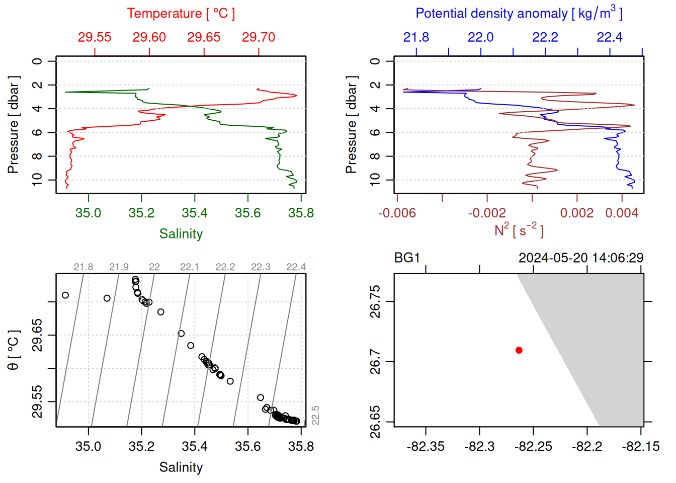 tryCatch({ trimmed_cast <-ctdTrim(cast) decimated_cast <-ctdDecimate(trimmed_cast, p =0.1)# plotting can cause the xlim failureplot(decimated_cast)# === export ===# Get the scan numbers that remain after cleaning cleaned_scans <- decimated_cast@data$scan# Load original raw data to keep all columns ctd_raw <- readr::read_csv(dataFile, show_col_types =FALSE)# Filter raw data to only include the cleaned scans cast_df <- ctd_raw %>%filter(!is.na(sea_water_pressure)) %>%# Remove rows without pressure datamutate(row_num =row_number()) %>%filter(row_num %in% cleaned_scans) %>%select(-row_num)# Add metadata cast_df <-mutate( cast_df,station = station_id,cruise_id = cruise_id )# Check if there are any rows in the cleaned dataif (nrow(cast_df) ==0) {cat("\n=== WARNING: NO DATA AFTER CLEANING ===\n")cat("Cast ID:", params$cast_id, "\n")cat("Station:", station_id, "\n")cat("Cruise:", cruise_id, "\n\n")cat("Raw data rows (with pressure):", sum(!is.na(ctd_raw$sea_water_pressure)), "\n")cat("Cleaned scans to keep:", length(cleaned_scans), "\n")cat("Resulting rows:", nrow(cast_df), "\n\n")cat("Raw data summary:\n")print(summary(ctd_raw[c("sea_water_pressure", "sea_water_temperature", "sea_water_salinity")]))cat("\nCleaned scans (first 20):\n")print(head(cleaned_scans, 20))cat("\n=== CSV FILE NOT CREATED (no data) ===\n\n") } else {# create folder if doesn't exist clean_data_loc <- here::here("data/02_clean")try(fs::dir_create(clean_data_loc))# save ctd to .csv (without row names/indices)write.csv(cast_df, glue("{clean_data_loc}/{params$cast_id}.csv"), row.names =FALSE)cat("Successfully saved", nrow(cast_df), "rows to", glue("{params$cast_id}.csv"), "\n") }}, error =function(e) {cat("\n=== CTD PROCESSING ERROR ===\n")cat("Cast ID:", params$cast_id, "\n")cat("Error message:\n", conditionMessage(e), "\n\n")# Safely inspect objects that might or might not exist when the error happenedif (exists("decimated_cast")) { df <-try(as.data.frame(decimated_cast@data), silent =TRUE)if (!inherits(df, "try-error")) {cat("Dataframe columns:\n")print(names(df))cat("\nSummary of key columns (scan, pressure, temperature, salinity if present):\n") known_cols <-intersect(c("scan", "pressure", "temp", "temperature", "salinity", "conductivity"), names(df))print(summary(df[known_cols], digits =3))cat("\nHead of dataframe:\n")print(head(df)) } else {cat("Could not extract dataframe from decimated_cast.\n") } } else {cat("decimated_cast was never created before the error.\n") }cat("\n=== END ERROR DEBUG INFO ===\n\n")})