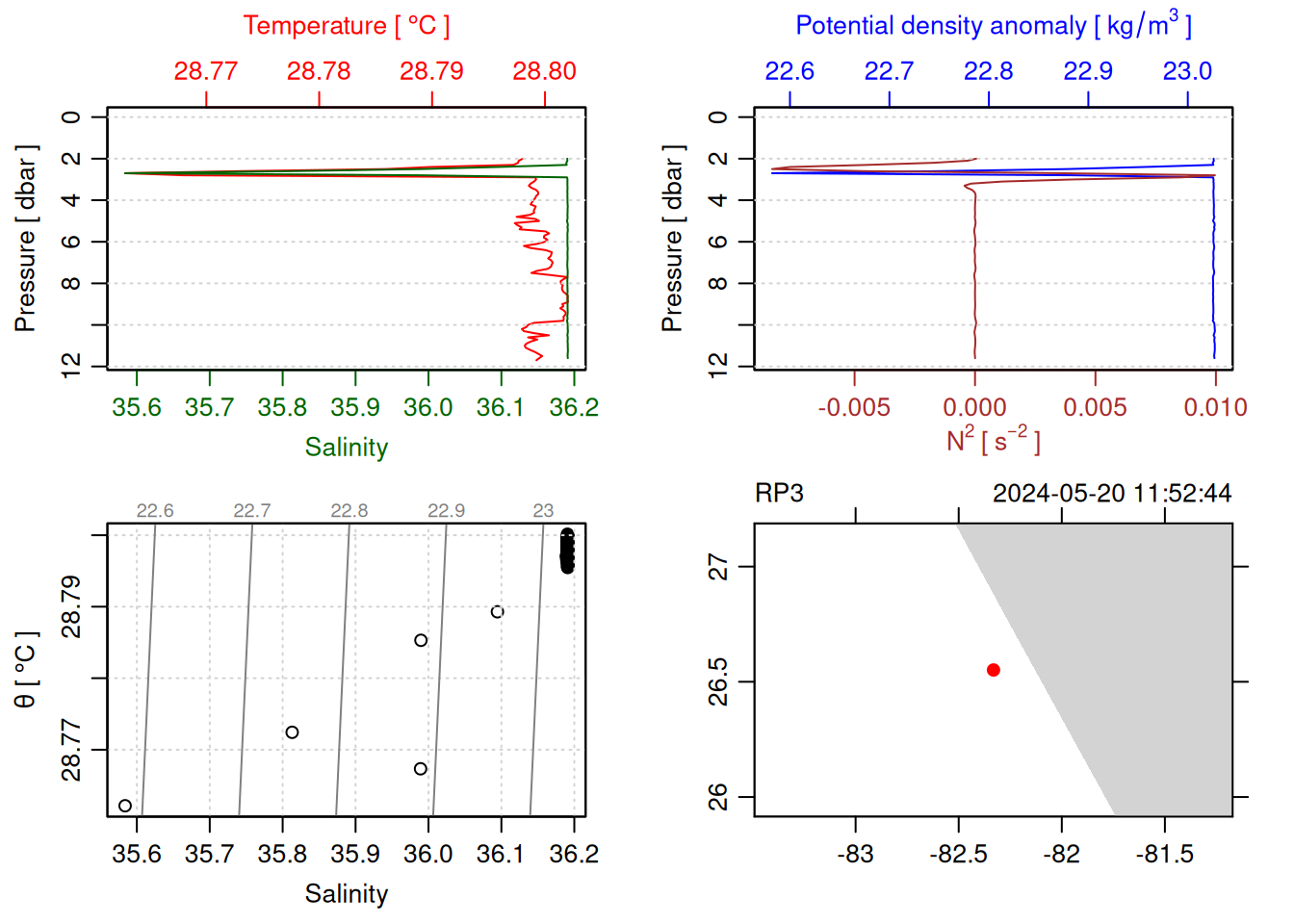 tryCatch({ trimmed_cast <-ctdTrim(cast) decimated_cast <-ctdDecimate(trimmed_cast, p =0.1)# plotting can cause the xlim failureplot(decimated_cast)# === export ===# Get the scan numbers that remain after cleaning cleaned_scans <- decimated_cast@data$scan# Load original raw data to keep all columns ctd_raw <- readr::read_csv(dataFile, show_col_types =FALSE)# Filter raw data to only include the cleaned scans cast_df <- ctd_raw %>%filter(!is.na(sea_water_pressure)) %>%# Remove rows without pressure datamutate(row_num =row_number()) %>%filter(row_num %in% cleaned_scans) %>%select(-row_num)# Add metadata cast_df <-mutate( cast_df,station = station_id,cruise_id = cruise_id )# Check if there are any rows in the cleaned dataif (nrow(cast_df) ==0) {cat("\n=== WARNING: NO DATA AFTER CLEANING ===\n")cat("Cast ID:", params$cast_id, "\n")cat("Station:", station_id, "\n")cat("Cruise:", cruise_id, "\n\n")cat("Raw data rows (with pressure):", sum(!is.na(ctd_raw$sea_water_pressure)), "\n")cat("Cleaned scans to keep:", length(cleaned_scans), "\n")cat("Resulting rows:", nrow(cast_df), "\n\n")cat("Raw data summary:\n")print(summary(ctd_raw[c("sea_water_pressure", "sea_water_temperature", "sea_water_salinity")]))cat("\nCleaned scans (first 20):\n")print(head(cleaned_scans, 20))cat("\n=== CSV FILE NOT CREATED (no data) ===\n\n") } else {# create folder if doesn't exist clean_data_loc <- here::here("data/02_clean")try(fs::dir_create(clean_data_loc))# save ctd to .csv (without row names/indices)write.csv(cast_df, glue("{clean_data_loc}/{params$cast_id}.csv"), row.names =FALSE)cat("Successfully saved", nrow(cast_df), "rows to", glue("{params$cast_id}.csv"), "\n") }}, error =function(e) {cat("\n=== CTD PROCESSING ERROR ===\n")cat("Cast ID:", params$cast_id, "\n")cat("Error message:\n", conditionMessage(e), "\n\n")# Safely inspect objects that might or might not exist when the error happenedif (exists("decimated_cast")) { df <-try(as.data.frame(decimated_cast@data), silent =TRUE)if (!inherits(df, "try-error")) {cat("Dataframe columns:\n")print(names(df))cat("\nSummary of key columns (scan, pressure, temperature, salinity if present):\n") known_cols <-intersect(c("scan", "pressure", "temp", "temperature", "salinity", "conductivity"), names(df))print(summary(df[known_cols], digits =3))cat("\nHead of dataframe:\n")print(head(df)) } else {cat("Could not extract dataframe from decimated_cast.\n") } } else {cat("decimated_cast was never created before the error.\n") }cat("\n=== END ERROR DEBUG INFO ===\n\n")})
